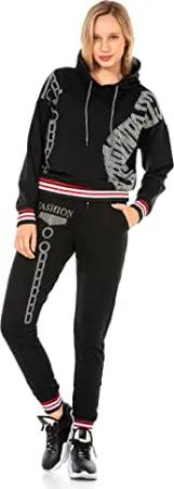 Damen Jogginganzug WLR139 Schwarz – Zweiteiliges Set aus Kapuzenjacke und Jogginghose mit modischem Design, hohem und sportlich-femininer Passform - WLR139 Schwarz L