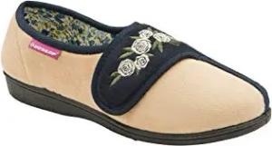 Damen Memory Foam Frottee Hausschuhe Klettverschluss mit Blumen für Senioren (38 EU, Navy Cream)