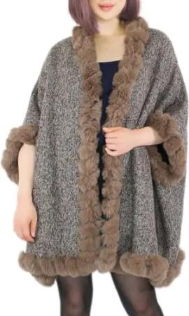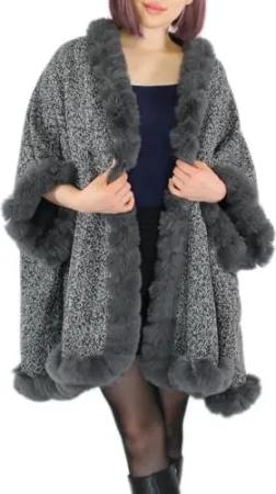 Damen Poncho Umhang Mantel Jacke mit Innenfutter und Kunstfell in Unifarben und Meliert - PN003 (DE/NL/SE/PL, Numerisch, 38, 42, Regular, Regular, PN003-Grau)