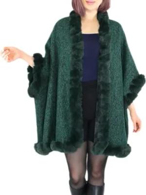 Damen Poncho Umhang Mantel Jacke mit Innenfutter und Kunstfell in Unifarben und Meliert - PN003 (DE/NL/SE/PL, Numerisch, 38, 42, Regular, Regular, PN003-Dunkelgrün)