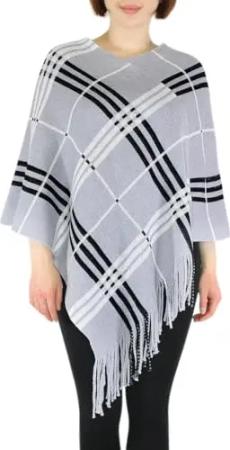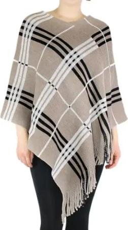 Verspielter Damen Strickponcho mit Fransen im lebhaften Karo-Muster - PJ100 (DE/NL/SE/PL, Alphanumerisch, Einheitsgröße, Regular, Regular, PJ100-Hellgrau)