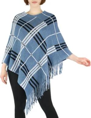 Verspielter Damen Strickponcho mit Fransen im lebhaften Karo-Muster - PJ100 (DE/NL/SE/PL, Alphanumerisch, Einheitsgröße, Regular, Regular, V-Ausschnitt, Ärmellos, PJ100-Blau)