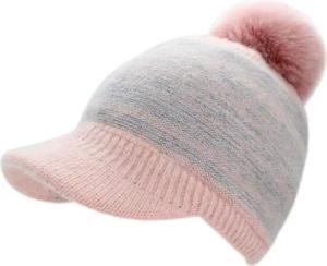 Warme Damen Strickmütze mit festem Schirm, gefüttert und zweifarbig - Winter Schirmmütze mit Bommel - A500 (DE/NL/SE/PL, Alphanumerisch, Einheitsgröße, A500-ZartrosaGrau)