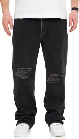 . Herren Jeans Ripped Loose-Fit Jeanshose 100% Baumwolle Denim Baggy Hose Straight-Leg Used Look Men's DC_JN-249-Washed Black-W32/L32