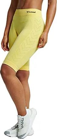 Damen Nahtlos LCI Antibakteriell Stretch Mittlere Bundhöhe Fitness Radlerhose - Schöllkraut Melange - Gelb, XS