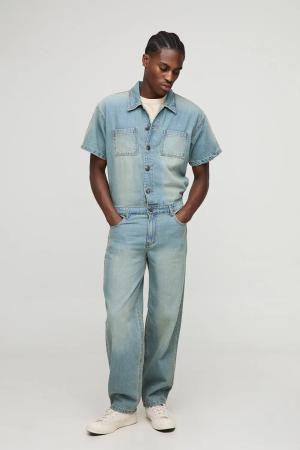 Short Sleeve Relaxed Washed Denim Boilersuit - Antique Blue - S, Antique Blue