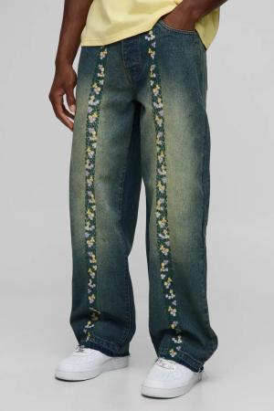 Relaxed Floral Embroidery Denim Jeans With Let Down Hem - Green - 32R, Green