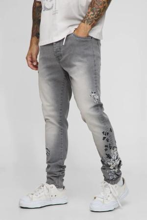Florale Skinny Jeans mit Stickerei - Grau - 28R, Grau