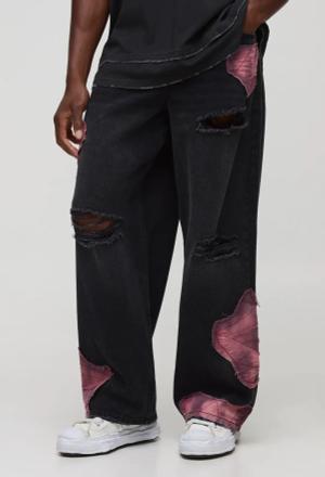 Lockere Patchwork Jeans mit Rissen - Schwarz - 28R, Schwarz