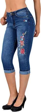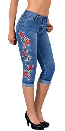 Damen Capri Jeans Hose Damen Caprihose Kurze Jeans mit Blumenstickerei 3/4 Hose bis Übergröße J374