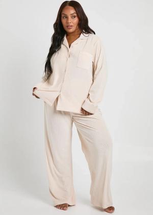 Womens Plus Rib Velour Trouser Pj Set - Cream - 48, Cream
