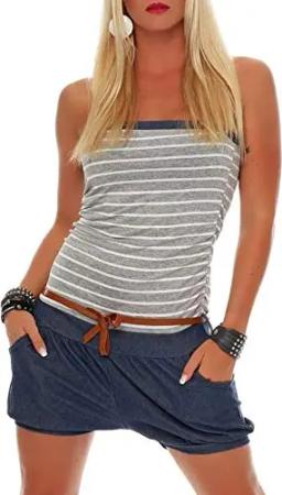 Malito Damen Einteiler kurz im Marine Design | Overall mit Gürtel | Jumpsuit im Jeans Look | Romper - Playsuit 9646 (hellgrau)