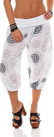 Malito - Damen Haremshose kurz mit Print - Pumphose aus Baumwolle - Leichte 3/4 Stoffhose - Pluderhose zum Tanzen, Chillen & Yoga - knielange Capri Hose 7182 (Weiß)