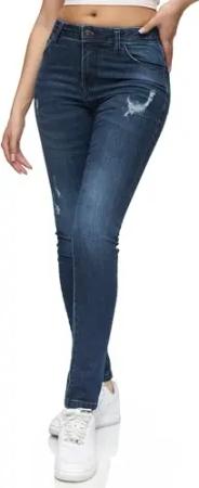 Damen Destroyed Mid Waist Skinny-Fit Stretch Denim Jeans RJ-1003 Dunkelblau 32