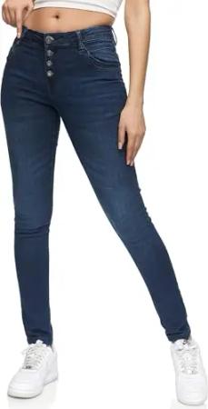 Damen Knopf Mid Waist Skinny-Fit Stretch Denim Jeans RJ-1004 Dunkelblau 32