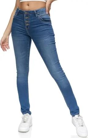 Damen Knopf Mid Waist Skinny-Fit Stretch Denim Jeans RJ-1004 Mid Blue 32