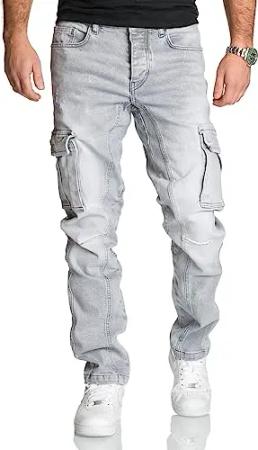 Herren Cargo Jeans Regular Slim Denim Hose Destroyed R7977 Grau W38/L32