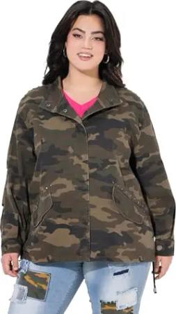 Damen große Größen Übergrößen Plus Size Jacke, Boxy Fit, Camouflage, Bindeband am Saum schilfgrün 52 840665196-52