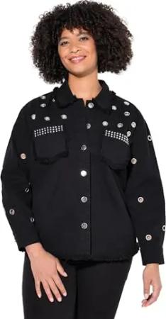 Damen große Größen Übergrößen Plus Size Jeansjacke, Ösen, Fransensaum, Hemdkragen, Langarm Black 48 830131133-48
