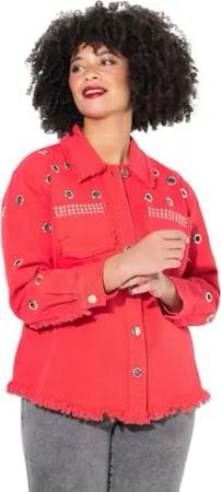 Damen große Größen Übergrößen Plus Size Jeansjacke, Ösen, Fransensaum, Hemdkragen, Langarm neon rot 56 830131520-56