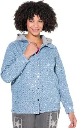 Damen große Größen Übergrößen Plus Size Sweatjacke mit Kapuze, vorne Denimoptik, Pailletten, Kapuze grau Melange 56 839173123-56