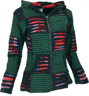 GURU SHOP Goa Patchwork Jacke, Boho Kapuzenjacke, Ethno Jacke - Grün/rot, Damen, Size:XL