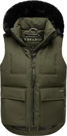 Damen ärmellose Outdoorweste warme Winterjacke mit Kapuze und abnehmbarem Kunstfell Zimthäschen XIV Dark Olive Gr. L