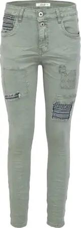 Damen Stretch Boyfriend Jeans - Patches Aufnäher - Five-Pocket im Crash-Look (S/36, Kakhi/Grün)
