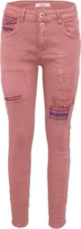 Damen Stretch Boyfriend Jeans - Patches Aufnäher - Five-Pocket im Crash-Look (XS/34, Beere)