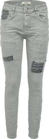Damen Stretch Boyfriend Jeans - Patches Aufnäher - Five-Pocket im Crash-Look (XS/34, Grau)