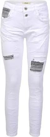 Damen Stretch Boyfriend Jeans - Patches Aufnäher - Five-Pocket im Crash-Look (XS/34, Weiß)