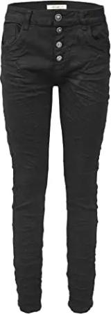Damen Stretch Jeans Five-Pocket im Crash-Look | Boyfriend Hose und sichtbarer Knopfleiste mit Schmuckknöpfen (as3, Numeric, Numeric_34, Regular, Regular, Schwarz, XS, Regulär)
