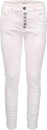Damen Stretch Jeans Five-Pocket im Crash-Look | Boyfriend Hose und sichtbarer Knopfleiste mit Schmuckknöpfen (S/36, Weiß)