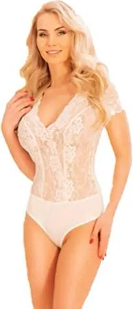 Damen Spitze Body Chang | Damenbody | Farbe: Ecru | Größe: M | Material: Tüll | One Piece Dessous | Spitzenausschnitt | Tüll-Bodysuit | Tüllspitze | Sexy Reizwäsche Unterwäsche Curvy Bodysuit