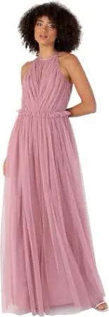 Women's Maxi Dress Ladies Sleeveless Halter Neck Ruffle Empire A-line for Wedding Guest Bridesmaid Ball Evening Occasion, Bridal Rose, 36