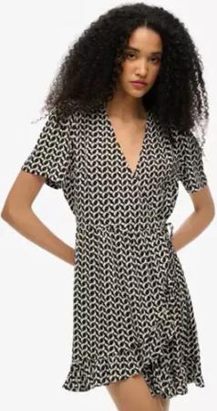 Superdry Damen Kurzärmeliges, Bedrucktes Mini-wickelkleid Schwarz - Größe: 44