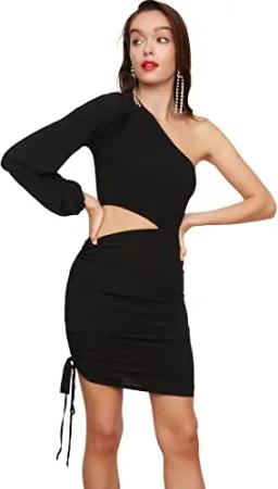Damen Woman Mini Bodycon Asymmetrischer Kragen Webstoff Kleid, Black, M