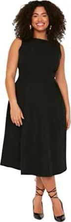 Damen Plus Size Midi A-line Relaxed Fit Woven Dress Kleid, Schwarz, 42 EU