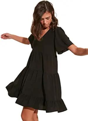 Damen Trendyol Woman Petite Mini Ruffle Hem V-Neck Woven Dress, Schwarz, 38 EU
