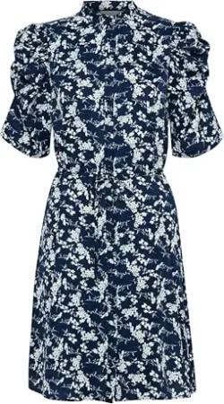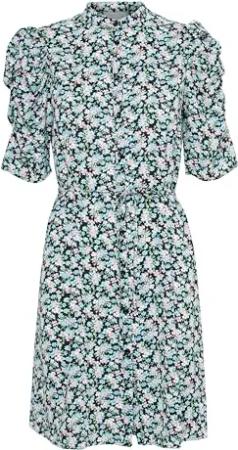 IXNINA Damen Kleid Midikleid Freizeitkleid mit Puffärmel Knöpfen Bindeband Regular fit, Größe:38, Farbe:Total Eclipse w. Blue Flowers (204390)