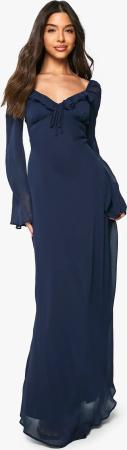 Womens Chiffon Plunge Ruffle Maxi Dress - Navy - 38, Navy