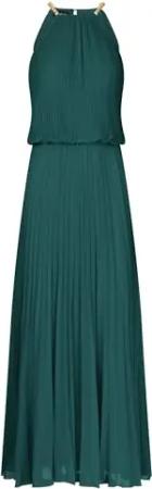 Damen Plissee-Maxikleid, Neckholder-Abendkleid, Elegantes Hochzeitsgastkleid, Silberne Kettenträger, Chiffonkleid, ärmelloses Partyoutfit, fließendes langes Kleid