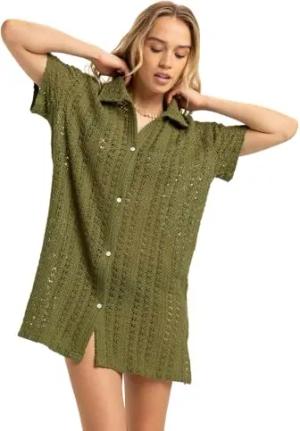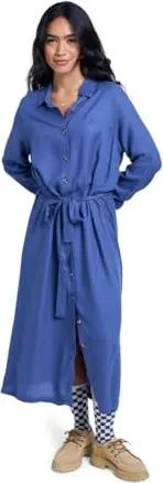 Island Escape Solid - Collared Long Sleeve Button Front Midi Dress for Women - Langärmliges Midikleid mit Knopfleiste - Frauen - L - Blau.