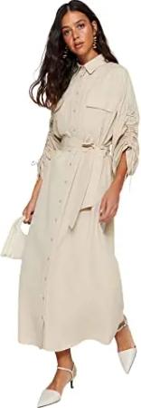 Women's Beigefarbenes, Verstellbares, Detailliertes Hemdkleid aus Baumwollgewebe mit Gürtel, Beige, 42