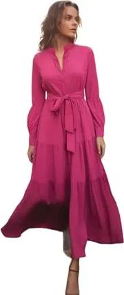Women's Dunkelrosa Gewebtes Kleid mit Gürtel und Großem Kragen und Knöpfen, Rosa, 38