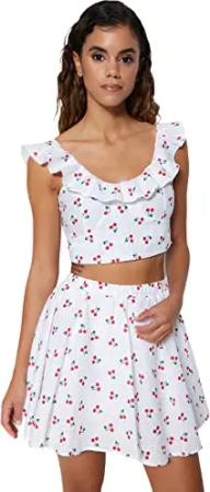 Women's Gemusterter Rüschen Detaillierter Unterer Top-Anzug Skirt Set, Weiß, 38