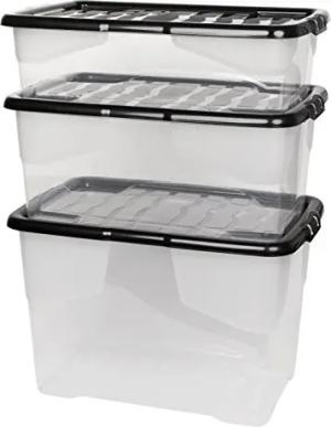 3 Stück Aufbewahrungsbox Curve mit Deckel aus transparentem Kunststoff. Nutzvolumen 65, 42 und 30 Liter. Stapelbar und nestbar. Einsehbar mit Deckel.
