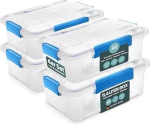 Aufbewahrungsbox 11,4 Liter mit Deckel – wasserdicht & staubdicht, transparent & stapelbar, BPA- & schadstofffrei, robuste Kunststoffbox mit Silikondichtung & 4 Clips (4, 11,4 Liter)