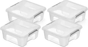 Aufbewahrungsbox mit Deckel (4x43L) Robuste Transportbox, Kleiderbox, Kunststoffbox mit Deckel und Rollen, Stapelbar, lebensmittelecht und BPA-frei! Aus Kunststoff in Transparent.