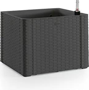 Quadratischer Pflanzkasten im Rattan-Design aus Kunststoff in Anthrazit. Mit Wasserspeicher und Wasserstandsanzeige. Maße BxTxH in cm: 43 x 43 x 33 cm.